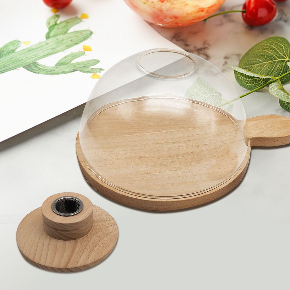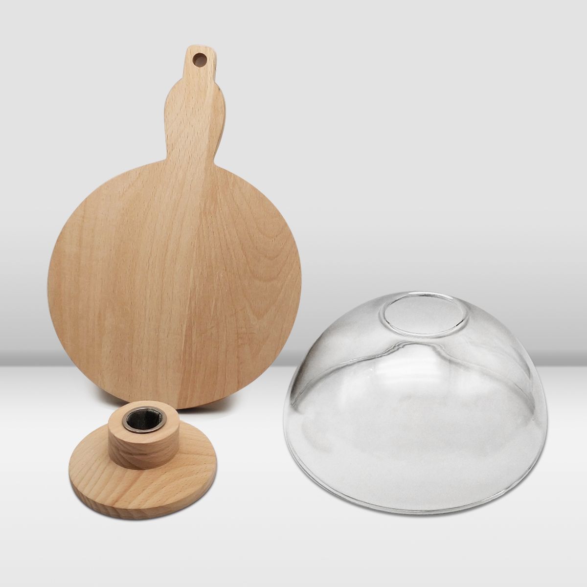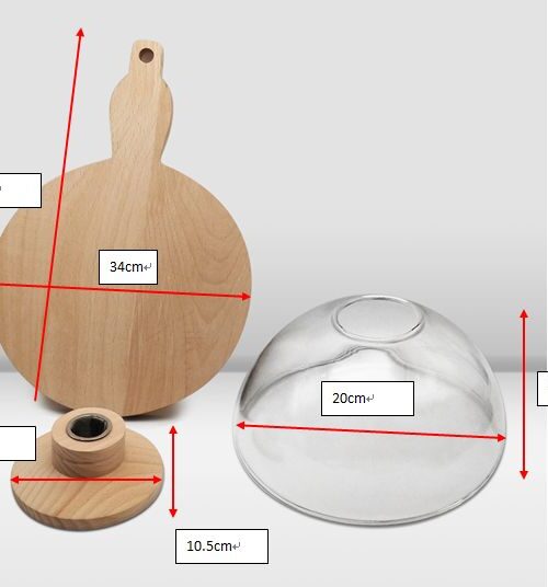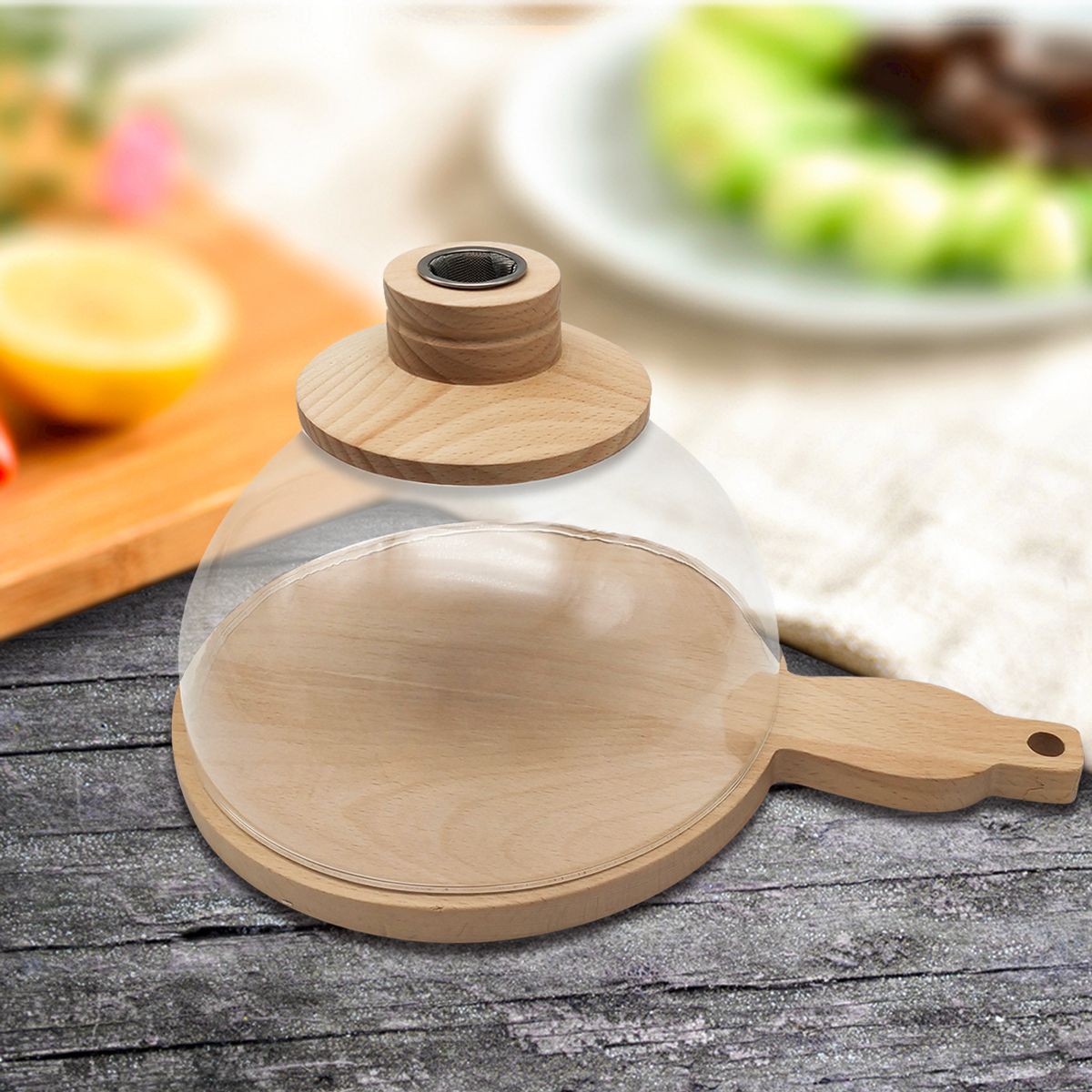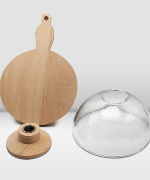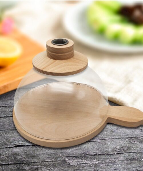 The 10 cm high glass dome paired with a 20 cm diameter wooden base is perfect for smaller dishes, tapas, or individual cocktail servings. Its compact size allows you to add smoky flavor without overpowering the presentation, making it ideal for refined culinary and beverage experiences.